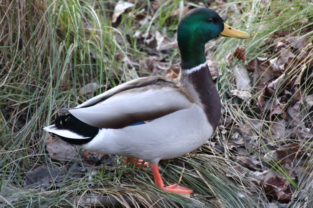 El plumaje de la cabeza y cuello del macho es de color verde brillante con irisaciones, bajo los cuales presenta un estrecho collar blanco. El pecho es castaño, el dorso parduzco y el vientre gris. La parte trasera de color negro, resalta sobre los extremos blancos de las plumas rectrices (últimas plumas del ala). El pico es amarillo con la uña negra y las patas poseen una coloración anaranjada. En su coloración destacan, por un lado, las dos plumas negras y rizadas que presentan sobre la cola, y por otro, el espejuelo del centro de las alas, de una tonalidad azul violácea.