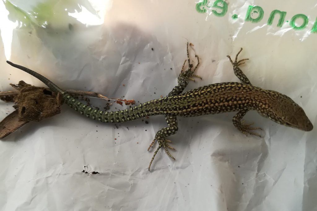 Después de molestarlo un poquito y como el río no estaba muy lejos, lo recogí de nuevo y lo acerqué hasta las proximidades de la orilla. No lo dejé allí porque la especie está considerada como vulnerable y en gran parte es debido a su captura por el ser humano para tenerlo como mascota. Así que pensé que mejor era quitarlo de la vista del público, no siendo que fuera a acabar en algún jardín privado o dentro de alguna vulgar contenedor de plástico.